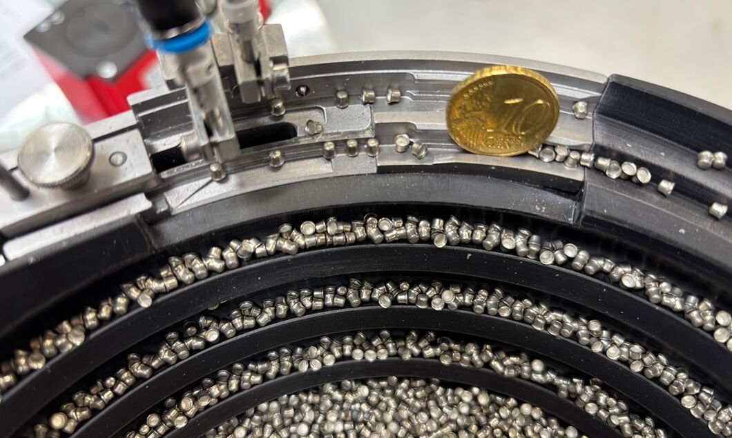 The conductor sleeve, measuring just 3 x 2.5 mm, was supplied in two lanes at a distance of 129 mm and lifted vertically upwards into the customer's gripper. The parts were pre-oriented in a CNC-milled polyamide bowl and aligned at the bowl outlet on a two-lane sorting curve, contrary to their actual physically determined preferred position.